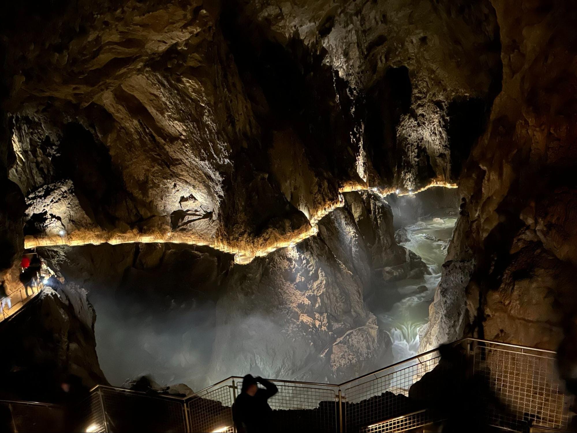 Avant la Croatie et le soleil, nous quittions donc tranquillement la Slovénie par des routes aux aires de Suisse, toujours humides et nuageuses. Après le gros épisode de pluie et la rescousse du warmshower, nous avons fait une pause d’une demi-journée pour visiter les grottes de Škocjan. J’ai rarement vu merveille naturelle plus impressionnante. On entre d’abord dans des petits tunnels silencieux remplis de stalactites/mites rassemblées comme le magot de l’île de Monte-Cristo. Plus on avance plus les cavernes gagnent en volume jusqu’à trouver des voutes aux dimensions cathédralesques. En continuant à descendre doucement, une rumeur sourde se fait, le décor baroque se transforme en simples parois rocheuses, tout devient plus inquiétant. Quand on débouche dans l’immense galerie (vaticanesque), le bruit ne permet plus d’entendre les indications du guides. Une descente en lacet nous emmène tout droit vers une rivière souterraine au flux surpuissant, certainement boosté par les pluies de la veille. On traverse alors toute la galerie longue de presque un kilomètre avec des frissons dans le dos et la presque-certitude de découvrir les mines de la Moria. Je suis ressortit de là avec un mélange de soulagement et de satisfaction d’avoir vu un endroit aussi dingue.