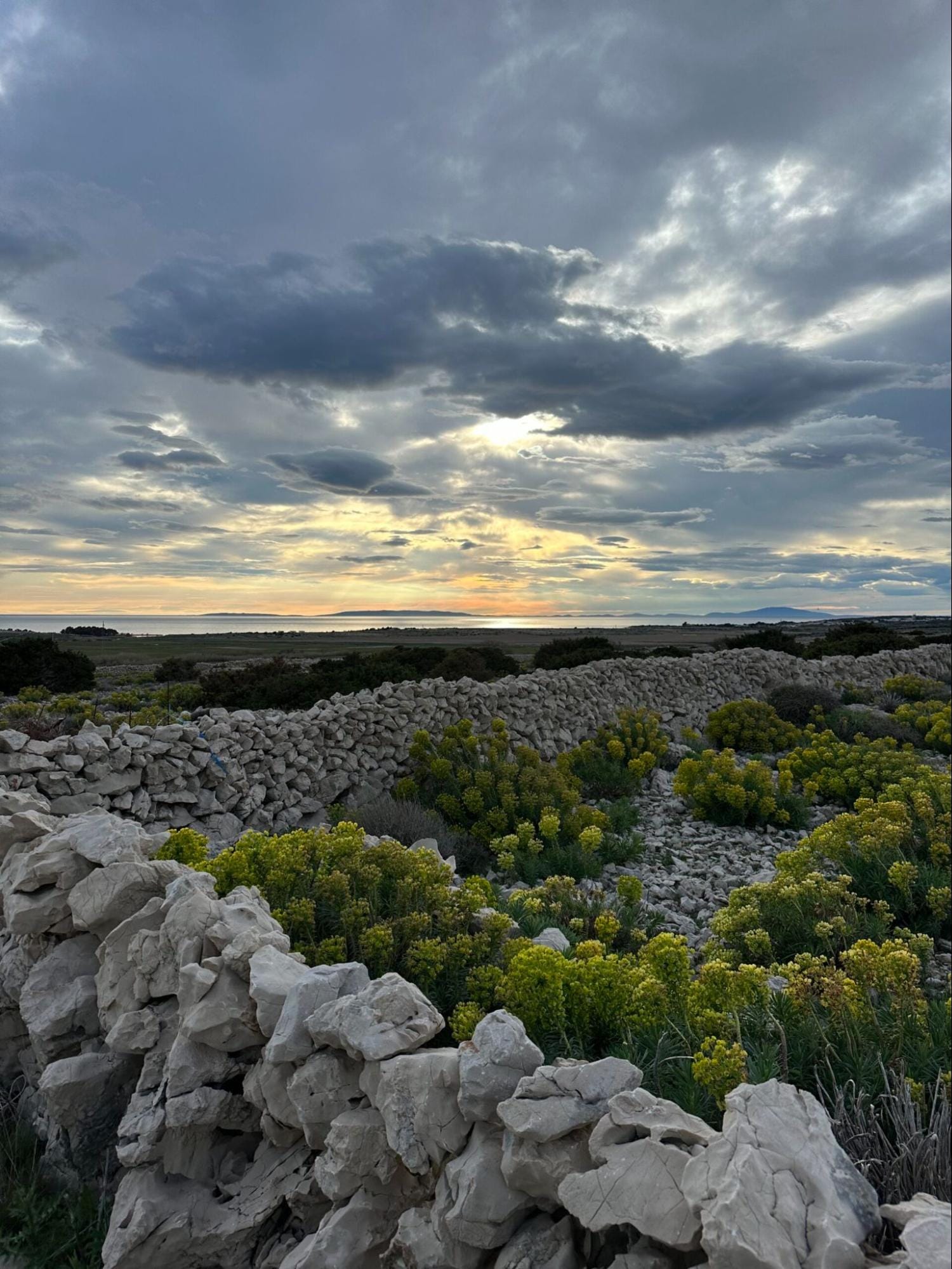 Nous avons eu l’impression de traverser des campagnes désertes voire abandonnées avant d’arriver sur la côte de Rijeka, ville portuaire grouillante. Idem sur les îles que nous avons ensuite explorées, l’activité essentiellement touristique ramène tout à la mer. Je ne m’attendais pas du tout à cela. Je m’imaginais un pays beaucoup plus semblable à l’Italie. Mais ici c’est dur et sec comme le caillou. Les îles ont gardé une belle part sauvage. Elles sont extrêmement rocailleuses, pourvues uniquement de plages de rochers. L’intérieur est souvent désert mis à part quelques enclos de moutons ou chèvres qui se débrouillent pour trouver de l’herbe entre les cailloux. On comprend pourquoi la Croatie a misé sur le tourisme et pas l’agriculture : 20% du PIB contre 3% (en France c’est 6% contre 3%). Qui dit tourisme dit constructions. Les villes balnéaires paraissent déjà bien construites pour le peu de monde qu’on y croise au mois d’avril. Étrange paradoxe de voir tant d’habitations en construction et si peu de gens. Mais il paraît que la zone est envahie par l’Allemagne et l’Autriche chaque été, tout cela doit avoir un sens.