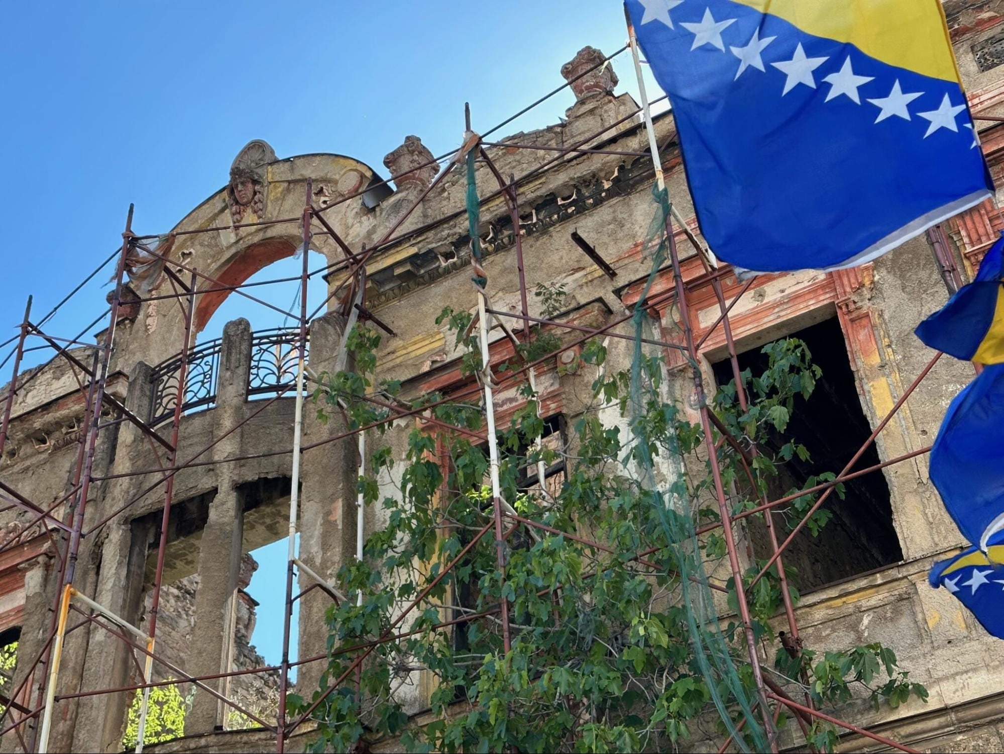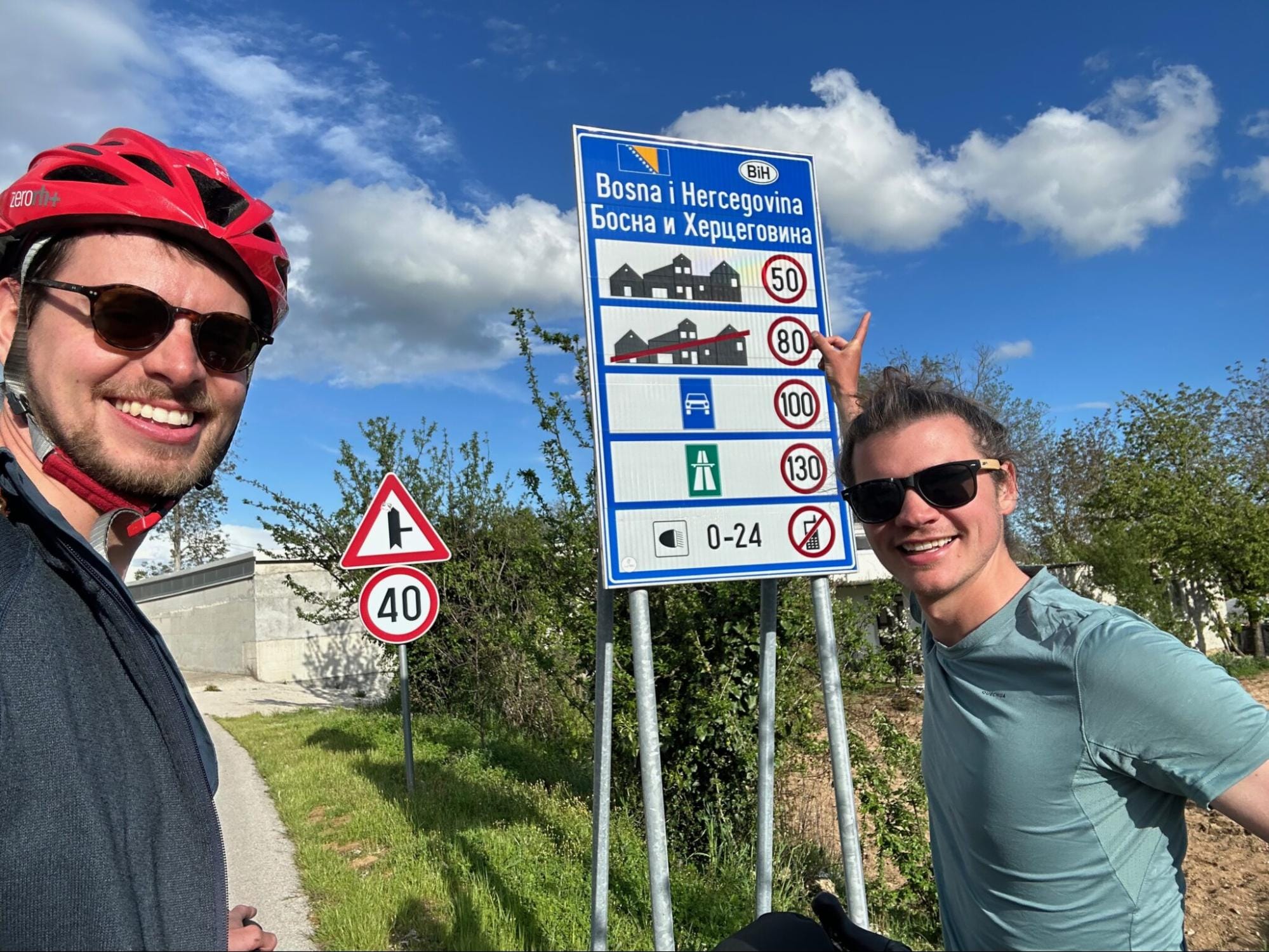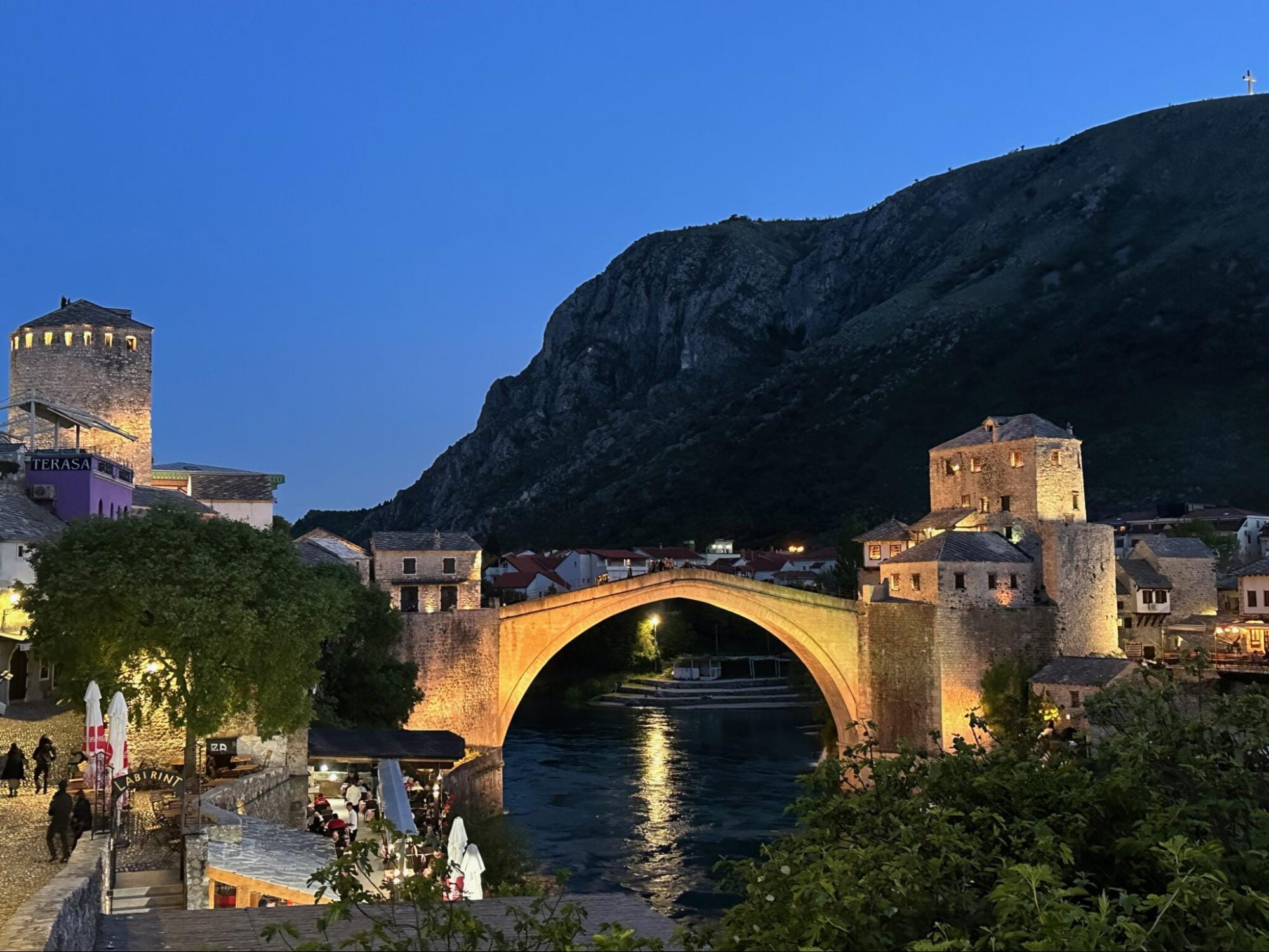 À une poignée de kilomètres du poste-frontière, cette accueil formidable nous donna un belle introduction au pays. Nous avons continué notre chemin, bousculés par des automobilistes beaucoup moins ravis de nous voir. En fin d’après-midi nous arrivons à Mostar. Ville qui frappe dès qu’on y rentre à la vue de ses bâtiments monumentaux en ruine ou sévèrement amochés, tous criblés d’impacts de balles. La guerre des Balkans y a fait rage de 1992 à 1995. Toute la ville n’a pas encore pansé ses plaies, mais la paix semble y régner, les chants du muezzin ne sont pas entrecoupés par le son des cloches et inversement. Mostar est une magnifique ville médiévale dont le symbole (détruit pendant le conflit) a été reconstruit à l’identique : le pont « Stari Most ».
