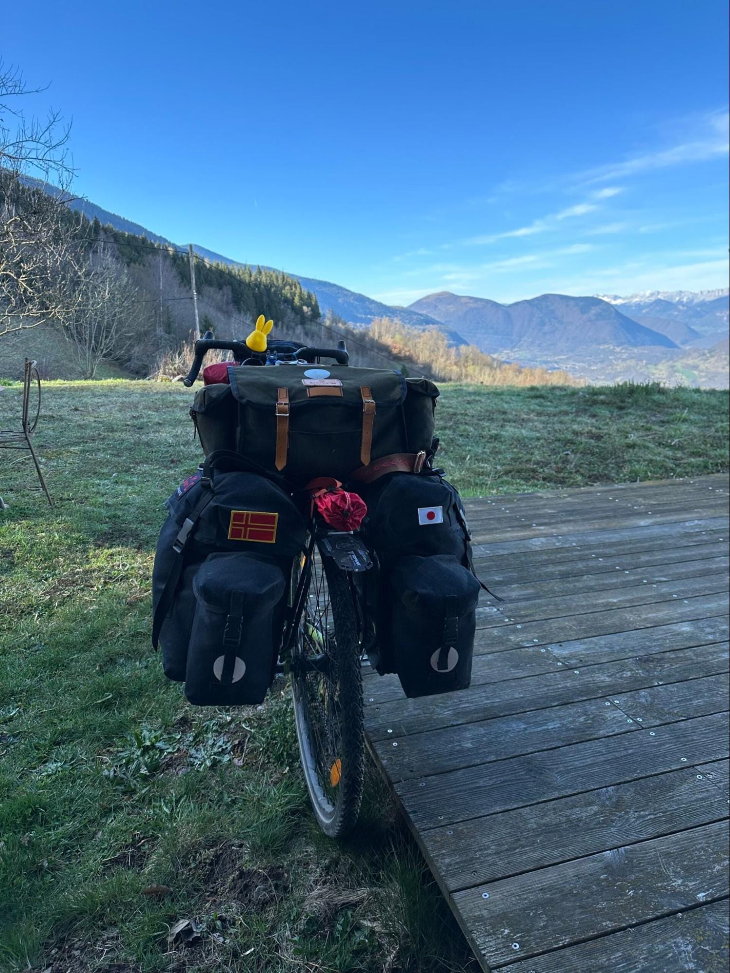 Après le portail rouge, c’est la porte des Alpes que nous avons franchi. Grenoble est derrière nous et nous commençons à peine à prendre des dénivelés assez sévères. C’est un bonheur que de prendre de la hauteur, voir loin, trouver du reliefs et admirer les montagnes au toupet enneigé. Cette semaine je commence doucement à prendre la mesure de ce qui nous arrive et avoir la sérieuse impression que ce ne sont plus des vacances sportives que nous vivons mais bien un voyage au long cours. On voit déjà les affaires qui s’usent autour de nous, les habitudes qui se créent et les lassitudes aussi. En ce qui concerne ces dernières, la météo est première responsable. Sujet trivial et pourtant déterminant dans n’importe quelle aventure en extérieur. Même si les affaires sont mouillées, la tente, les vélos, nos téléphones, nos carnets et nos vêtements, le plus dur c’est pour le mental. Notre humeur sera bonne ou renfrognée en fonction d’elle. Un rayon de soleil et on a l’impression de s’envoler, de sourire comme par réflexe.